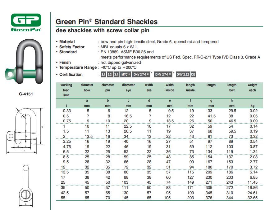 The Green Pin®Dee卸扣SC 是一種帶有螺母銷的D型卸扣。螺母銷使扣環(huán)能夠快速(拆)裝,使其非常適合在頻繁組裝和拆卸的索具活動(dòng)中使用。由于扣環(huán)經(jīng)過鍍鋅處理,其長(zhǎng)期耐用性得到保證。此外,扣環(huán)的設(shè)計(jì)減少了(鋼絲)繩的磨損,因?yàn)槁菁y隱藏在腔室內(nèi)。特別重要的是,The Green Pin® D型卸扣 SC 符合諸如 DNV GL 等船級(jí)社的廣泛認(rèn)證。Green Pin® Dee Shackle SC 僅適用于單腿吊裝系統(tǒng),工作載荷限值從 0.33 噸到 55 噸不等。